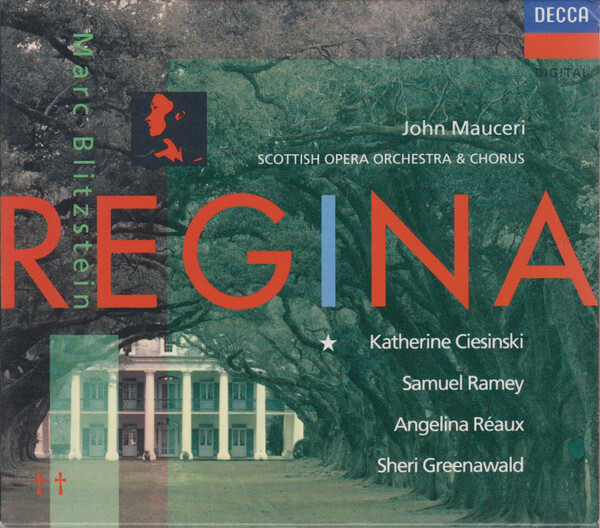 ブリッツスタインがアメリカ共産党を離れた年に初演された《レジーナ》は、プロローグと3幕から成る作品。ジャズの響きを採り入れつつ、心臓を患う裕福な銀行家ホレイス・ギデンズの妻レジーナが、兄と結託して夫から資金を引き出そうとする話を縦軸に、南郡の旧家のドロドロとした内実を鋭利に播いていく。なお、原作の戯曲を書いたリリアン・ヘルマン自身が脚本を担当した映画(邦題は『偽りの花園』)も著名である。