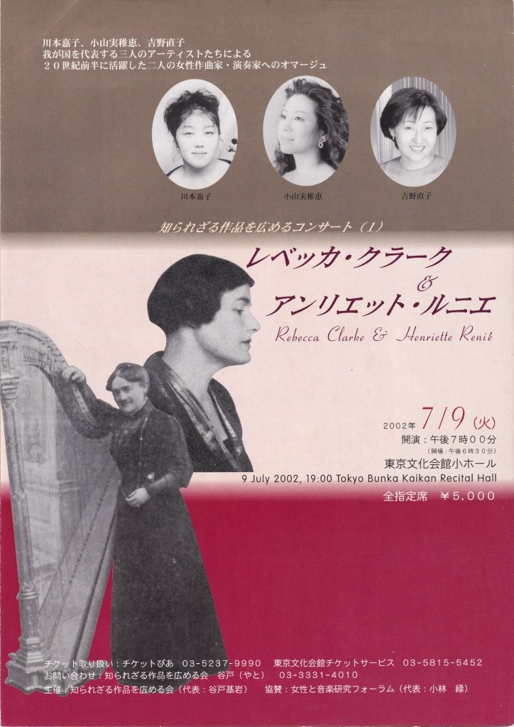 プロのマネージメントが組めるような、業界の価値観のツボを刺激するだけのコンサートは彼らに任せておけばいい。日本のクラシック音楽業界の価値観を拡張するような企画をするのでなければアマチュアがわざわざ企画する必然性はない、というのが私の考えだった。ちょうど妻の小林緑が様々な女性団体の協力を得つつ女性作曲家に特化したコンサートと講演を積み重ねていたので、業界人の端くれとしてその本格的な実現も手伝わねばという思いもあった。そこで「知られざる作品を広める会」を立ち上げ、2002年7月9日に東京文化会館小ホールで第1回目のコンサート「レベッカ・クラークとアンリエット・ルニエ」を企画した。出演は川本嘉子(ヴィオラ)、吉野直子(ハープ)、小山実稚恵(ピアノ)、有馬理絵(クラリネット)。個人的には吉野直子と小山実稚恵が共演する「2つの交響的小品」がひとつの目玉で、その点にマスコミも注目するのではと思っていたが……特に話題にもならなかったのは誤算だった。