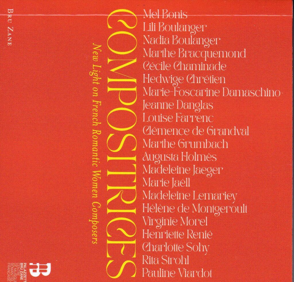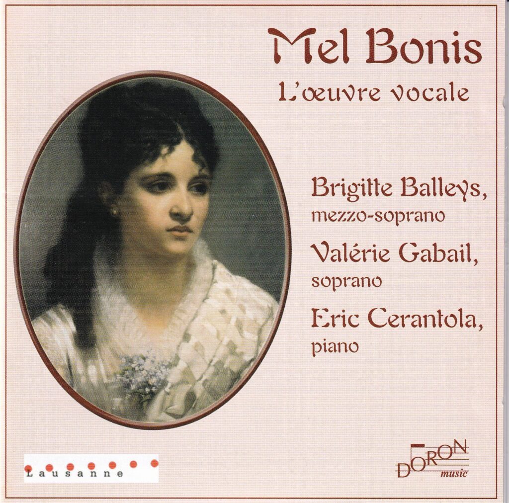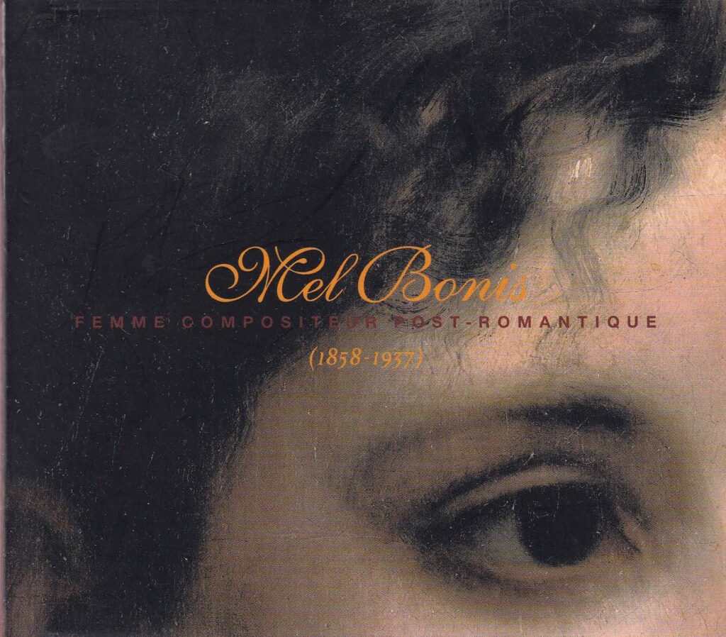 そして2010年代半ば過ぎあたりからペトルッチ(IMSLP)のサイトを通してダウンロードが可能になった作品が増えたせいもあってか(生前に出版されていた作品はかなり多い!)、メル・ボニスの作品の録音は世界的な拡がりを見せるようになって行った。様々な女性作曲家のアンソロジーを組む上で、フランス近代、ドビュッシーと同級生、シャミナードやブランジェ姉妹と同世代、フルート作品が多い、室内楽とピアノ曲のレパートリーが豊富——これらの特性が有効なのかもしれない。例えばフランス音楽の復興運動に心血を注ぐイタリアの団体「パラツェット・ブル・ザーネ」がBRU ZANEレーベルで発売した8枚組CD『COMPOSITRICES~フランス・ロマン派の女性作曲家たちに新しい光を』[BZ 2006]⑨の中にはメル・ボニスの管弦楽曲(オフェーリア、クレオパトラの夢、サロメ)、ピアノ連弾曲・独奏曲(《伝説上の女性たち》、《子供たちのアルバム》、ほか)、歌曲集(7曲)、チェロ・ソナタが収められ、総収録時間は120分近く、いかに同社がメル・ボニスにこだわっているかが良く判る。21人の作曲家が取り上げられている中で、突出して多くの時間を占めているのだ。とはいえもう一人、1月号で取り上げたマリー・ジャエルに関して、ブル・ザーネは別途3枚組のCDを発売。それには劣るといえばそうかもしれないが……
