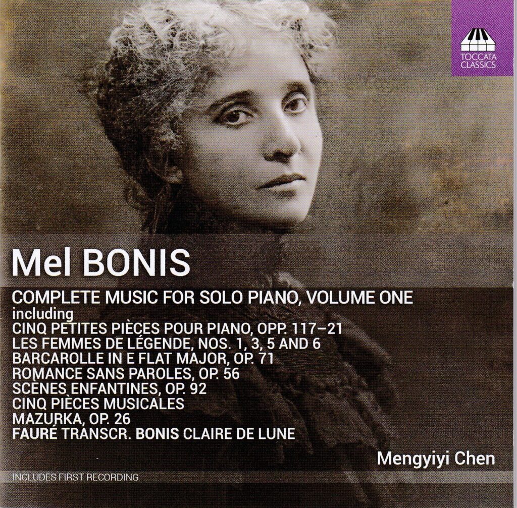 さらに様々な重要なレーベルから盛んにメル・ボニス一人にスポットライトを当てたCDが出るようになったのも2010年以降のことだ。オランダのET’CETERAレーベルからはヴェールレ・ペーテルスによる『傷ついた大聖堂~メル・ボニス:ピアノ作品集』[KTC 1422]が2010年に、メゾソプラノ、フルート、ピアノのTRIO ALOUETTEによる歌曲、フルート曲、ピアノ曲を収めた『メル・ボニスの音楽』[KTC 1524]が2015年に発売されている。またTOCCATA CLASSICSからは2023年に『ピアノ独奏曲全集第1集』[TOCC 0361]⑩が発売された。世界初録音となる《子供の情景》Op.92が収録されており、また詳細な作品一覧が付いているなどとても貴重な資料でもある。演奏は武漢出身のメンイイ・チェン。しっかりした演奏で好感が持てるが、この会社の全集はなかなか進まないことが多いのでその点が心配。